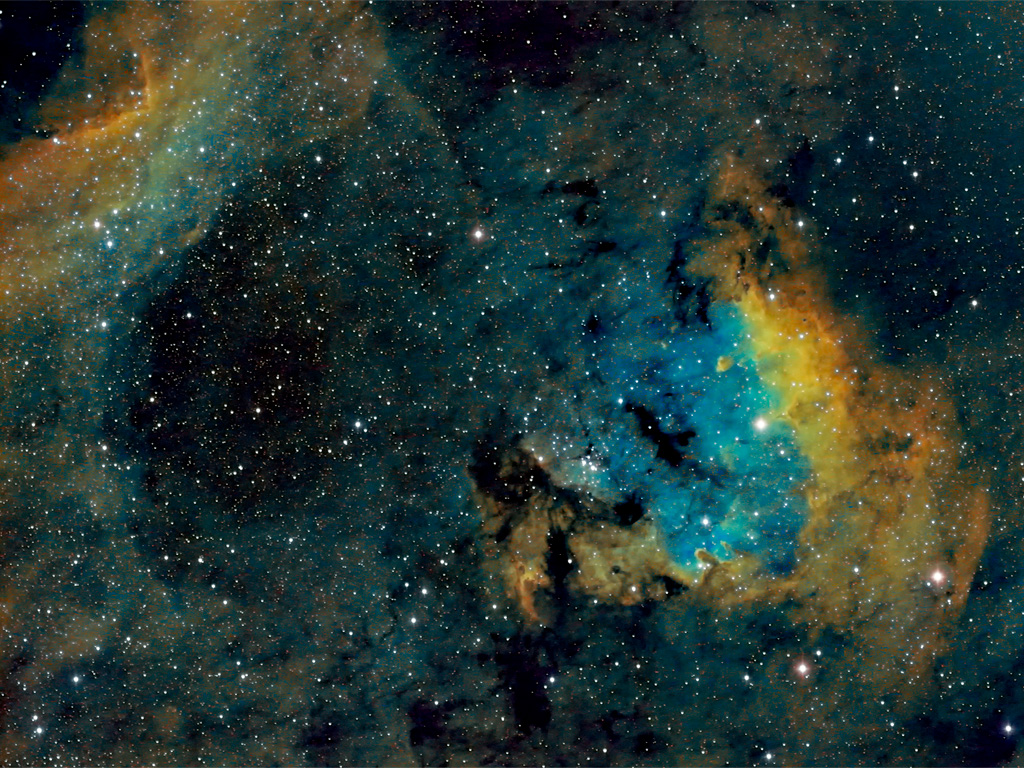 The image was processed with the HST palette assigning Red to SII, Green to Ha, and Blue to OIII.
