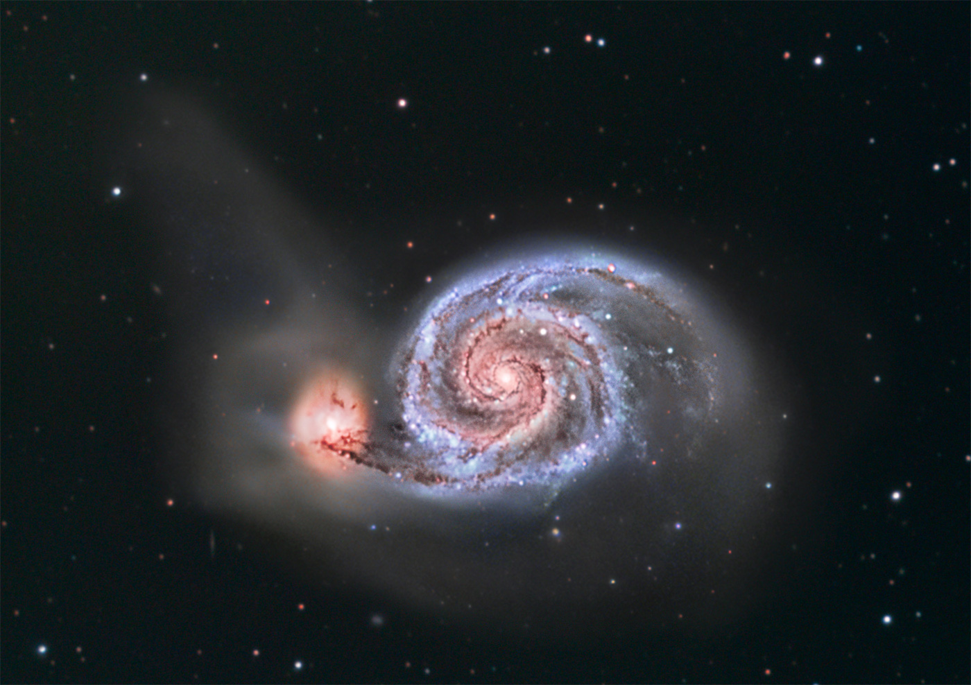 The body of the galaxy processed in LRGB with the 600s and 300s exposures. The core of the galaxy processed in RGB with the 60s exposures using layer masking in Photoshop. The Ha exposures where not used due to the lack of data for this filter. This image definitely needs more data.