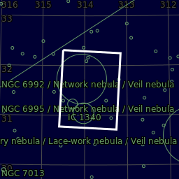 The Veil Nebula is a cloud of heated and ionized gas and dust in the constellation Cygnus of which the Eastern Veil Nebula is part. It constitutes the visible portions of the Cygnus Loop, a large but relatively faint supernova remnant. The source supernova exploded some 5,000 to 8,000 years ago, and the remnants have since expanded to cover an area roughly 3 degrees in diameter. The distance to the nebula is not precisely known, but data suggests a distance of about 1,470 light-years.