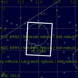 The Veil Nebula is a cloud of heated and ionized gas and dust in the constellation Cygnus of which the Eastern Veil Nebula is part. It constitutes the visible portions of the Cygnus Loop, a large but relatively faint supernova remnant. The source supernova exploded some 5,000 to 8,000 years ago, and the remnants have since expanded to cover an area roughly 3 degrees in diameter. The distance to the nebula is not precisely known, but data suggests a distance of about 1,470 light-years.